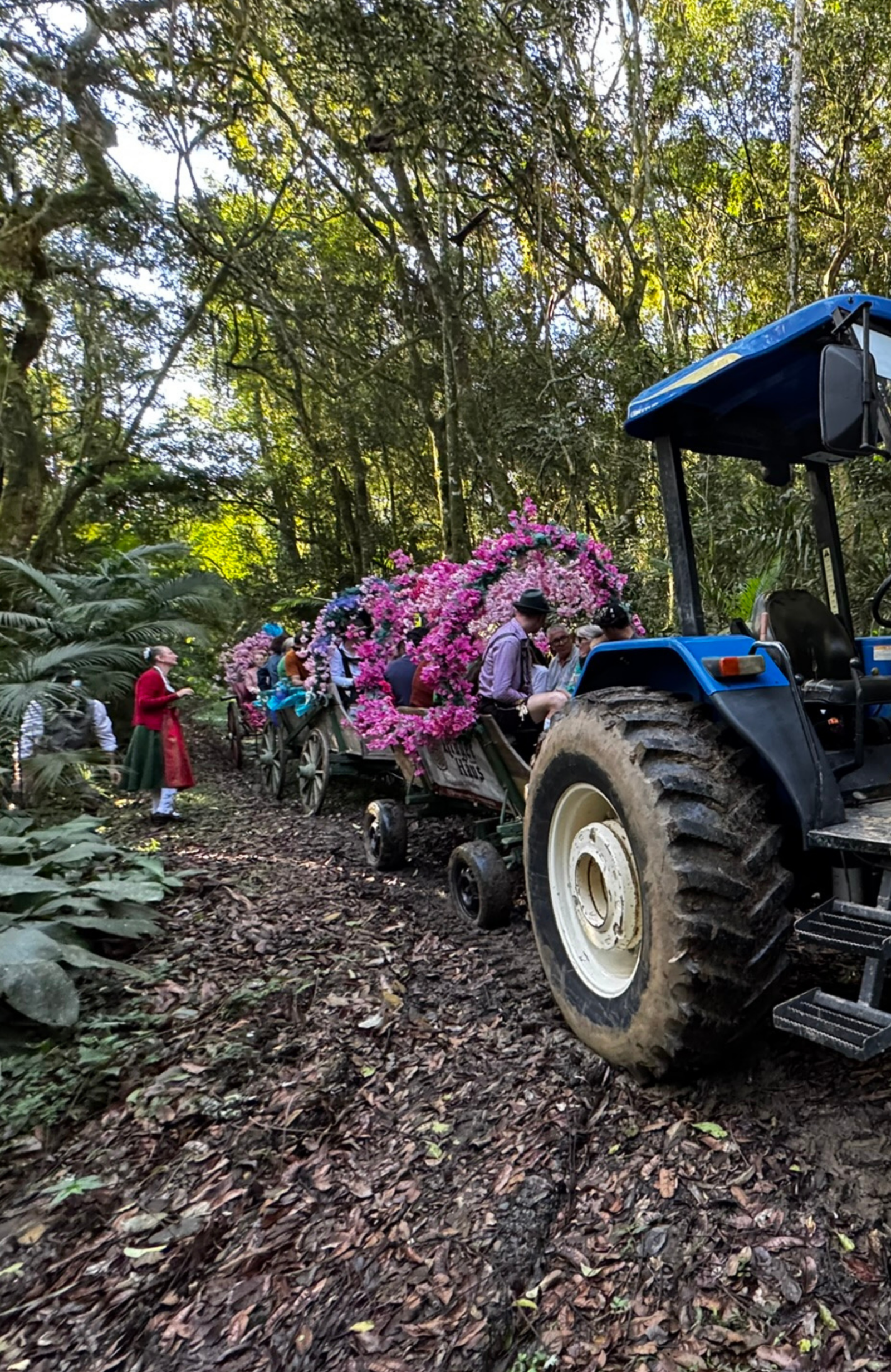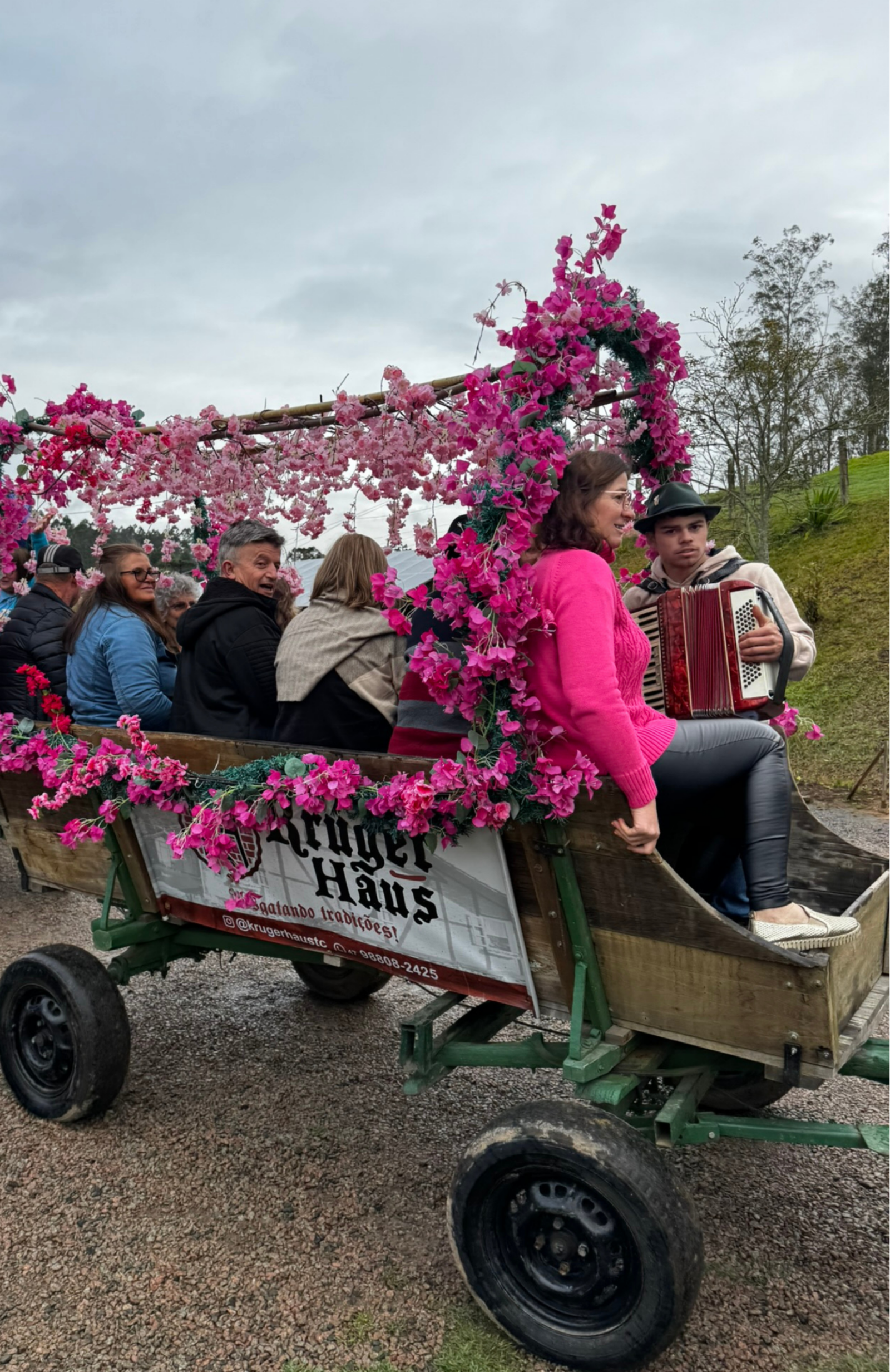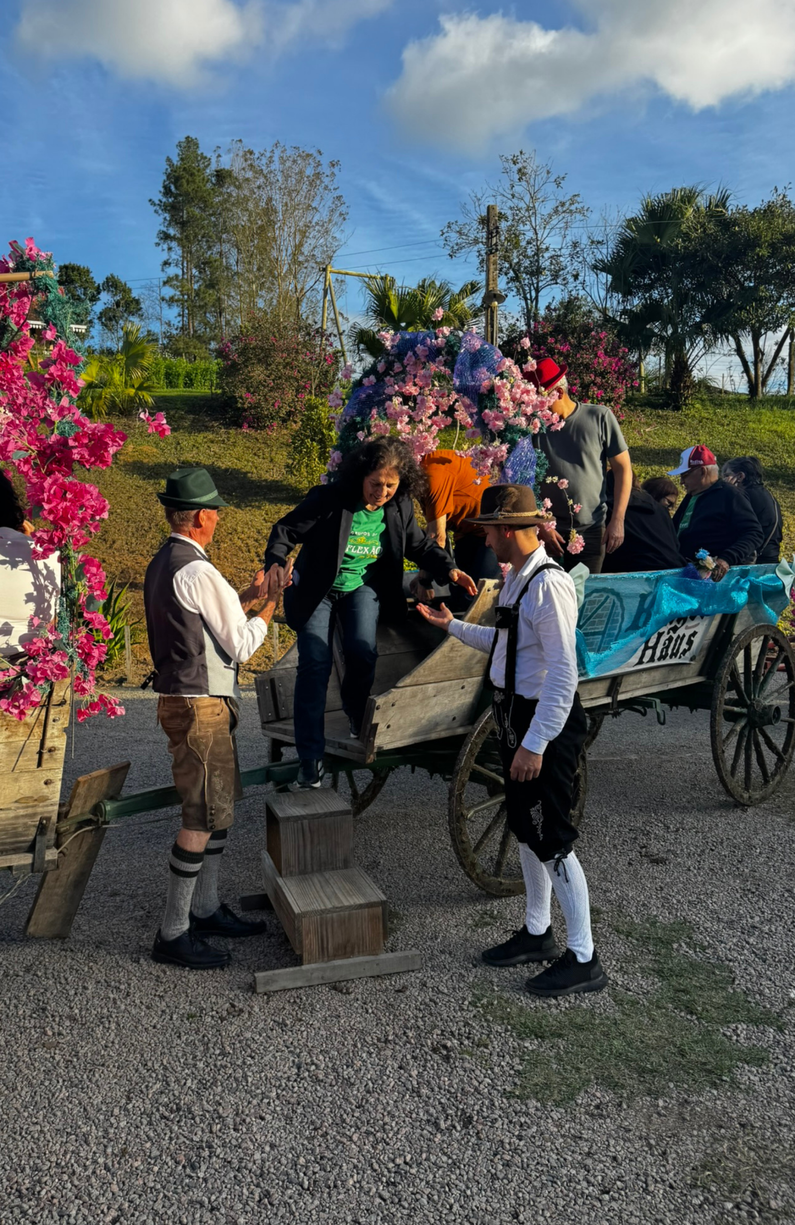 Passeios de carroça com música, descontração e natureza, passando por árvores nativas e paisagens que evocam a nostalgia e a tradição dos antigos imigrantes alemães.