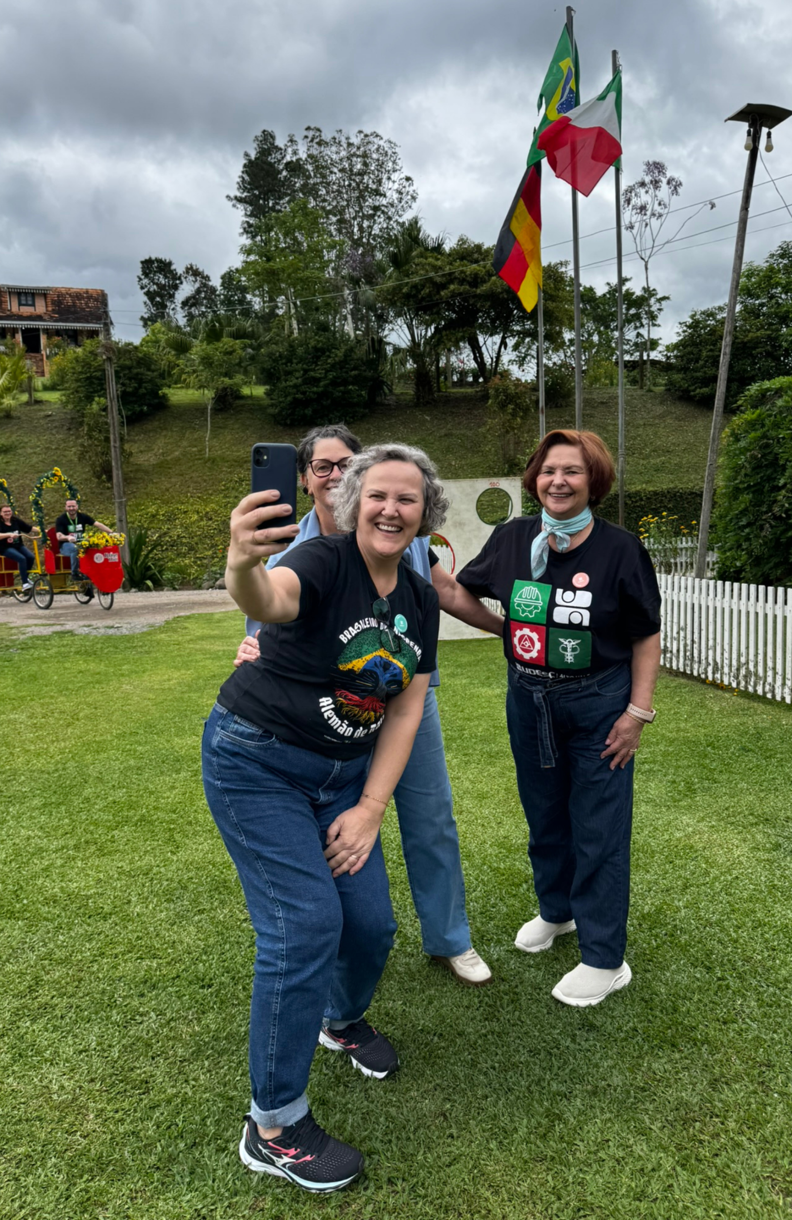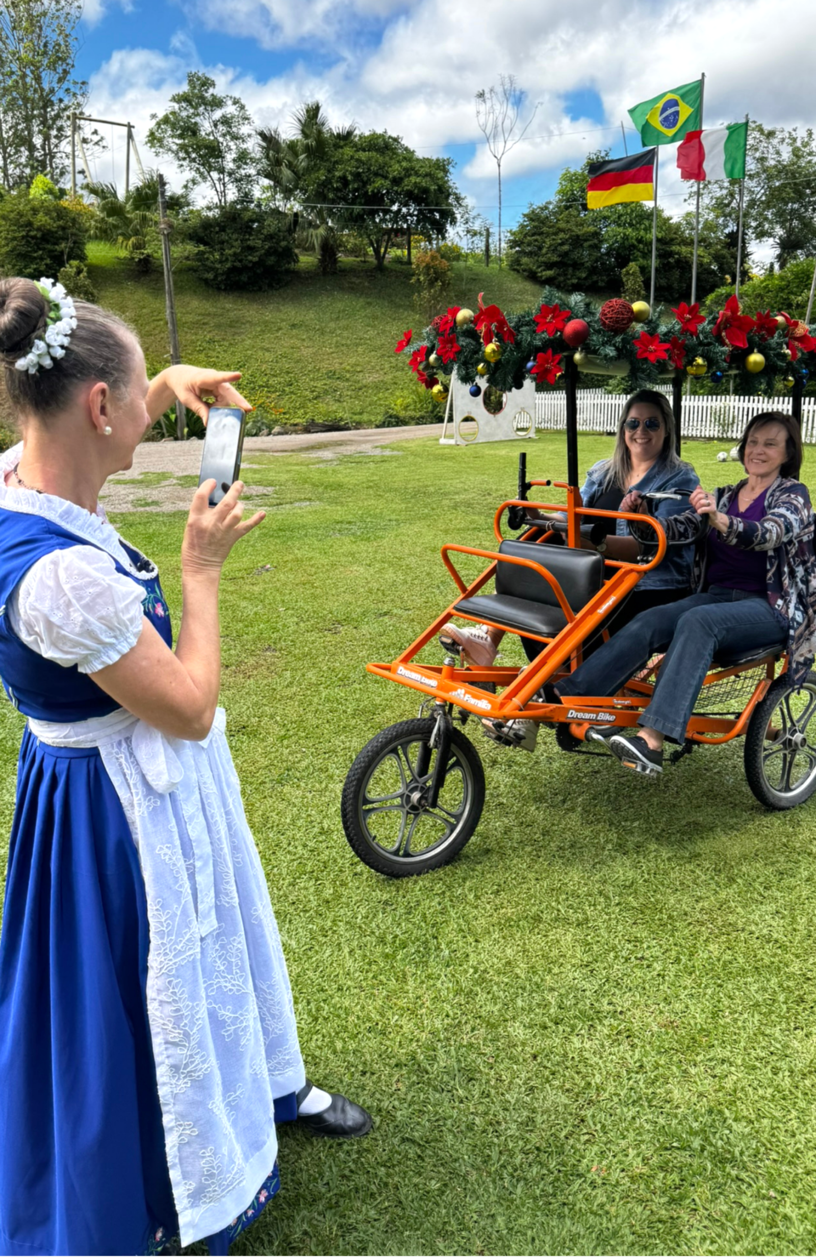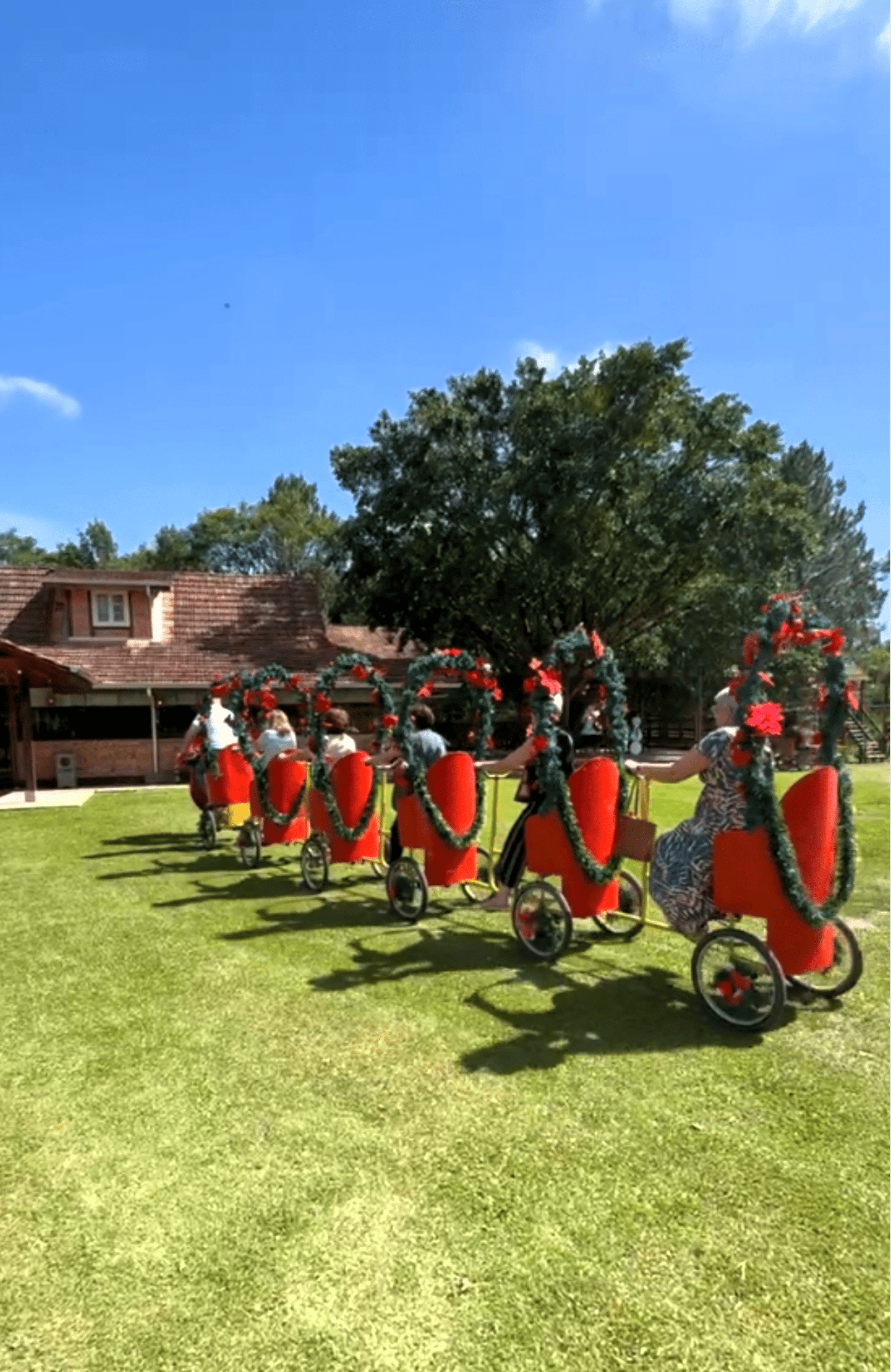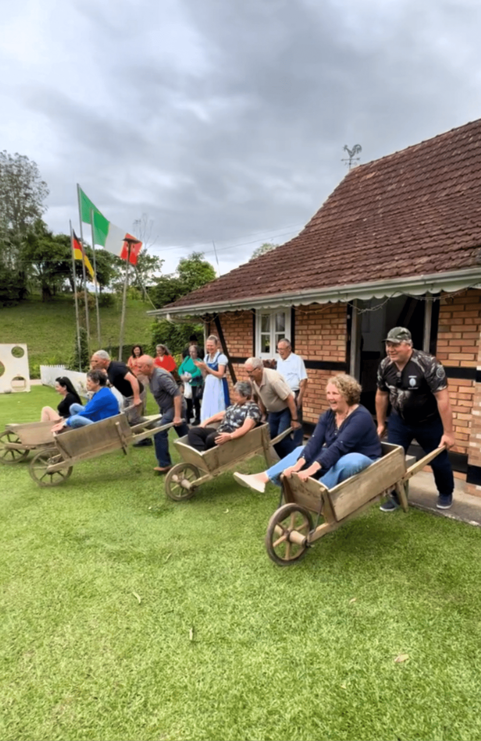 Passeios de carroça com música, descontração e natureza, passando por árvores nativas e paisagens que evocam a nostalgia e a tradição dos antigos imigrantes alemães.